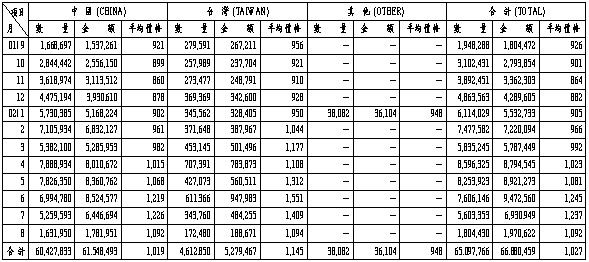單位:數量=kg、金額=千圓、平均價格=圓註:資料來源為日本財務省通關統計資料,其他為馬來西亞、泰國。